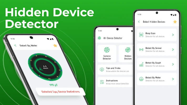 Kernen i Hidden Camera Detector Finder: Spy Device Detector udnytter din telefons indbyggede magnetfeltsensor til at lokalisere skjulte enheder. Du skal blot åbne applikationen og bevæge din enhed tæt på mistænkelige områder; Tracking Device Detector vil straks reagere med haptiske vibrationer og advarselstoner, så snart en potentiel trussel detekteres. Dette intuitive system gør det muligt at identificere aflytningsudstyr, trådløse kameraer og selv ledninger eller metalstrukturer bag vægge, lofter og gulve, forvandlende din smartphone til et kraftfuldt skjult sporingsdetektorværktøj.